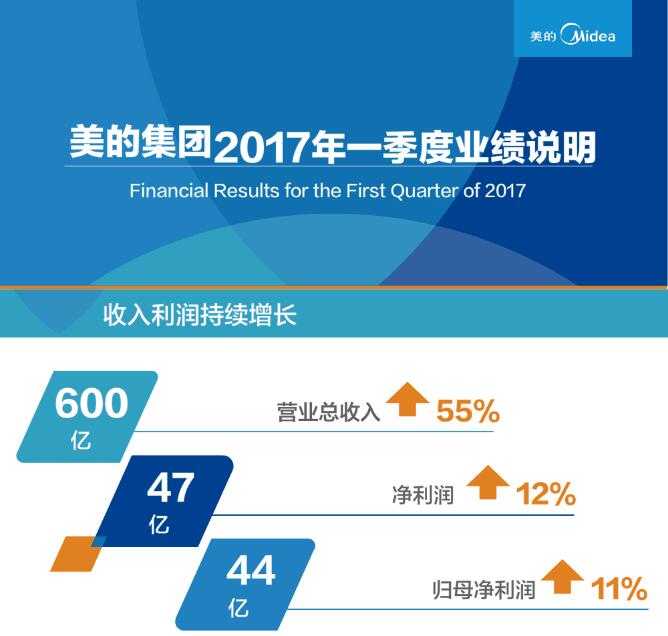 - 美的集团晚间发布一季报,2017年一季度实现营业总收入600亿,增长55%,净利润47亿,增长12%,归母净利润44亿,增长11%,每股收益