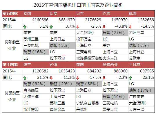 根据产业在线数据统计显示,2015年中国空调压缩机出口2287万台,同比下降3.9%。出口量排名前十的国家中,泰国、印度、波兰同比增长,表现良好。在各出口企业中,瑞智15年出口空调压缩机总量460万台,行业居首。总体来看,瑞智对应海外市场产品具有类型丰富、应用领域多元的特点;在出口区域上,巴西、波兰、台湾、美国等区域优势明显,稳居当地份额第一,泰国、印度、马来、土耳其等区域表现优异。不过,在海外出口上,海立、GMCC美芝等企业表现同样亮眼,瑞智未来需要进一步强化优势,加强竞争力。