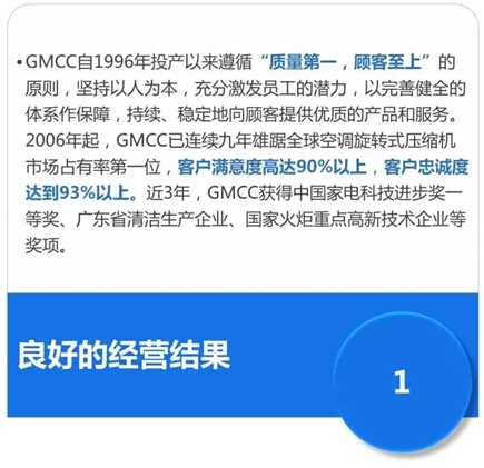 最新消息显示,GMCC凭借卓越的绩效体系,以得分第一的成绩,荣膺2015年度广东省政府质量奖。该奖项于2009年起举办,每2年评选1次,每次不超过10家企业获奖。在相关奖项方面,2011年,GMCC获得顺德政府首届质量奖,并于2013年获得佛山政府首届质量奖。