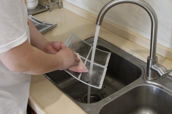 而滤网的清洁就没有那么讲究了,直接放在水龙头下面清洗就好了。清洗的时候注意滤网凹的一面在上,凸的一面在下,这样灰尘更容易被清洗掉。因为灰尘是吸附在上面的厚厚一层,冲洗是很难冲洗干净的,这时候可以用上刷子,简单高效。