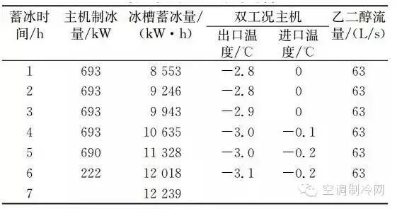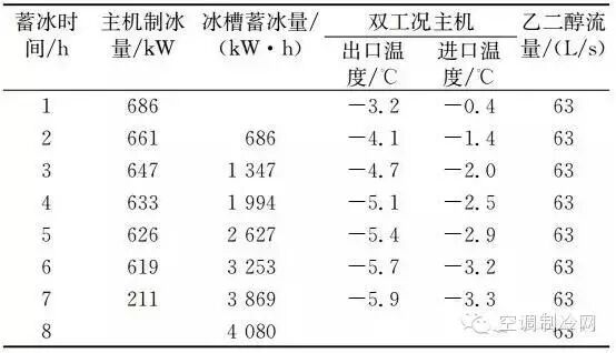 配置1台制冰量为615kW(175rt)的制冰主机,制冰温度-6℃,乙二醇流量为63L/s。制冰初期,制冰温度为-3℃,此时的实际制冰量约为693kW(197rt)。