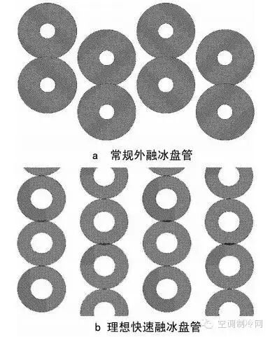 快速融冰盘管的换热面积较大、结冰厚度较小,理论上可减少盘管内管间距,缩小盘管的体积,理想的快速融冰盘管与常规盘管的结冰情况比较见图1。
