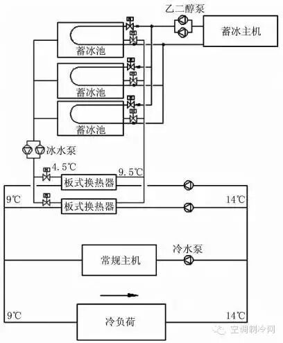 系统中需要设置1个板式换热器将通往冰槽的冰水与通向末端的冷水隔离,这是因为冰槽内的冰水为开式循环,直接与外界环境接触,有变脏的风险。