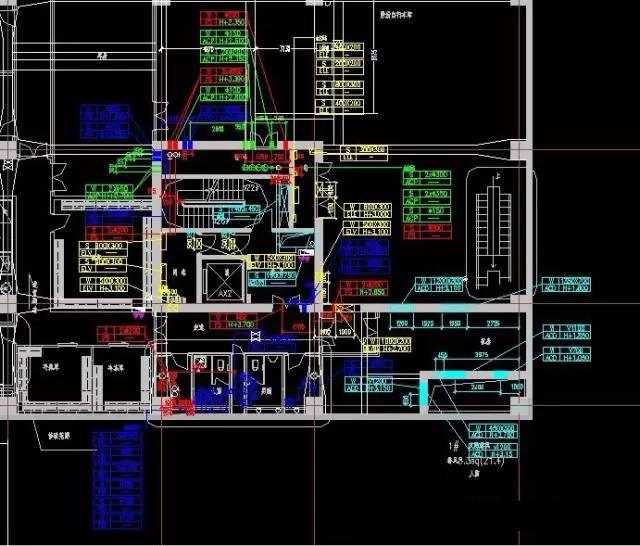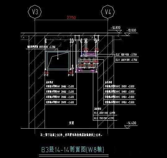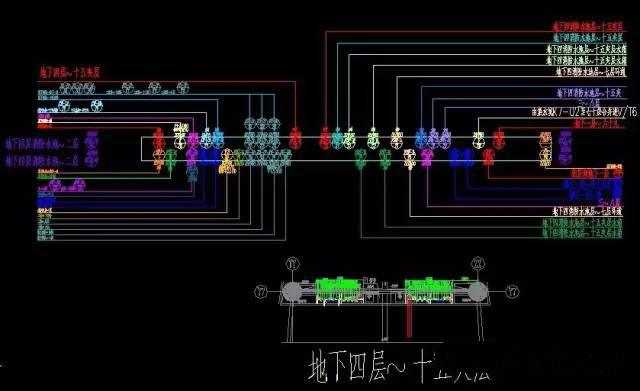 2.3.4按照CAD制图原则将机电各个专业深化图进行叠加,一定要做到分专业、分图层,然后进一步调整机电管线相对位置、标高,解决管线交叉问题,标出管线的平面位置、标高、上下返弯情况,合理利用空间,优化设计。对于上下重叠的管道,布置有困难时可以在平面图中错开,以提高图面的可视效果,在剖面图中体现出上下重叠的位置关系。
