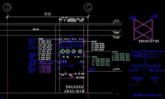 (3)综合平面图中风管、电缆桥架以双线表示,根据甲方要求大于DN50以上的水管也可需用双线表示;各种管线距离以中线表示,并注明截面尺寸;各种机电管线均应标注主要位置及高度变化处的标高;剖面图中管线表示外径或轮廓尺寸,并标注净距及标高。