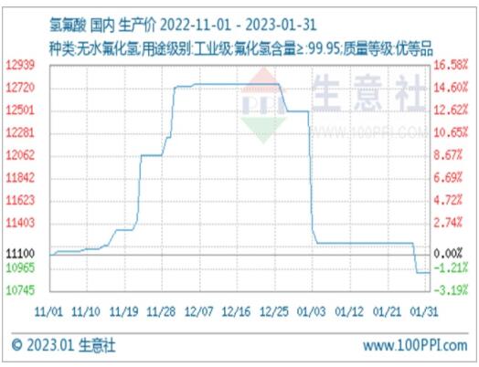 原料端:原料萤石市场价格走势下滑,截止月末国内萤石均价为3162.5元/吨,1月跌幅为4.17%。春节前后放假企业增多,萤石供应减少。加之矿山企业面临日益严厉的安全、环保要求,带来的萤石矿山开工仍显不足。虽然萤石供应方面有所减少,但是下游企业节前备货充足,采购方面稀少,场内萤石价格走势回落,氢氟酸受成本影响,市场行情大幅走低。